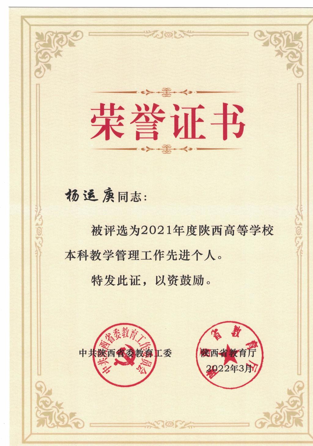 导航痕迹 首页 > 师资队伍 > 教师风采 > 正文 师资概况 教师简介 兼职教授 教师风采 李春平专栏 杨运庚被评为2021年度陕西高等学校本科教学管理工作先进个人 发布人:pp电子网站 发布日期:2022年06月07日 阅读次数: