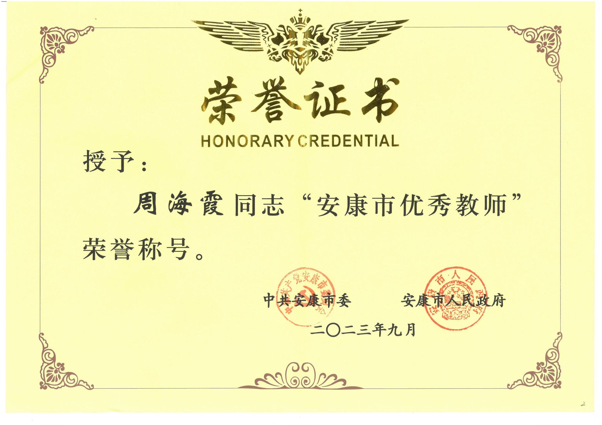 根据《关于推荐评选安康市教育工作先进集体和优秀教师、师德标兵、优秀班主任、先进教育工作者的通知》(安评组办发〔2023〕5号)精神和《pp电子网站关于开展2023年校级教职工荣誉评选工作的通知》(党政办发〔2023〕16 号)相关要求,经个人申报、学校组织专家评审,pp电子官网教师周海霞被评为pp电子网站优秀教师,同时被推荐参评安康市优秀教师,经安康市评审,确定周海霞为2023年安康市优秀教师。