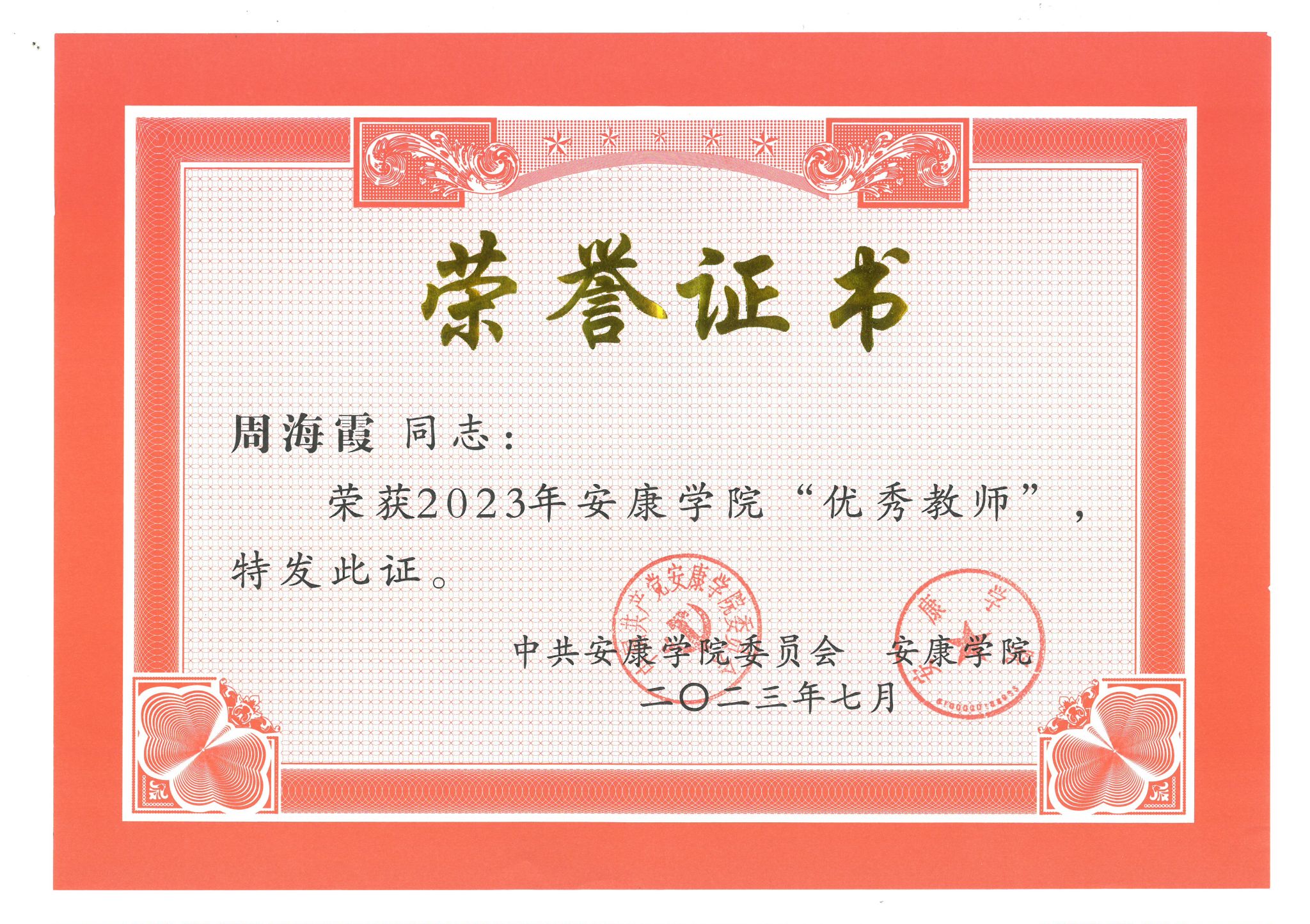 周海霞被评为pp电子网站、安康市优秀教师,这是pp电子官网长期注重师资队伍教学科研能力提升和教师职业道德涵养的又一成果,同时也是对周海霞长期潜心课程建设、教学改革和教育育人工作的充分肯定。