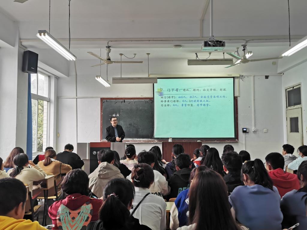 活动第一环节为课堂教学观摩。参与活动的教师于第6节课在1219教室集中观摩了胡少山老师主讲的中国秘书史课程。胡老师本讲在介绍隋唐时期秘书机构及其职能的同时融入了现代秘书从业技能的相关思考。