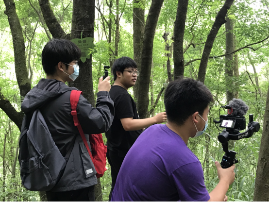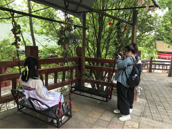 采风活动期间,8组学生在香溪洞风景区内有计划地在老师指导下进行创作。初入景区时,同学们还有一丝拘谨,面对竹木蔽山、花草遍地的自然风光,这丝拘谨很快被打破,大家相互配合,各自展开拍摄活动。有的用镜头捕捉自然倩影,有的在与景区工作人员交流中寻找新闻点,还有的拿出提前备好的道具圆一个古风剧场的梦……山涧鸟鸣、翠屏相列的风光不断激发同学们的创作灵感。采访声、讨论声、欢笑声回荡山间,为幽静的景区增添了些许活力;鲜红的院旗、彩色的衣服、各样的设备,为满目翠绿的景区增添了不少颜色;新闻、视频、短剧等创作,为静态景区提供了流动的名片。每日采风活动结束时,指导老师会召集各小组开会,总结当日拍摄情况和问题,并做出详细解答和指导。