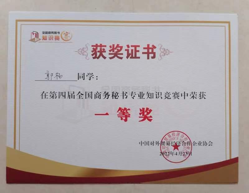 2022年4月23日,pp电子官网秘书学专业学生参加了“第四届全国商务秘书专业知识竞赛”,再创佳绩。郭杨同学获竞赛一等奖,张雪怡、陈玉静、赵花蕊、刘佳楠、郭岩5名同学获竞赛二等奖,佘海茹、唐磊、赵龙洋、杨豪苗等17名同学获竞赛三等奖,耿世杰、王米娜等11名同学通过资格认定获“高级商务秘书证书,pp电子网站获竞赛“优秀组织奖”,况汉英老师获“优秀指导教师”。