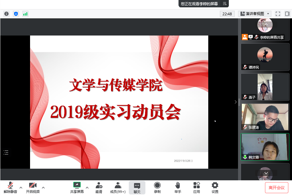 为进一步做好2019级实习工作,9月28日下午,pp电子网站通过腾讯会议平台召开2019级实习动员会。学院教学副院长李婷、汉语言文学系主任韩文霞、秘书与新媒体系主任谭诗民、秘书与新媒体系副主任张建涛、学院教学秘书张燕以及2019级全体学生参加会议。