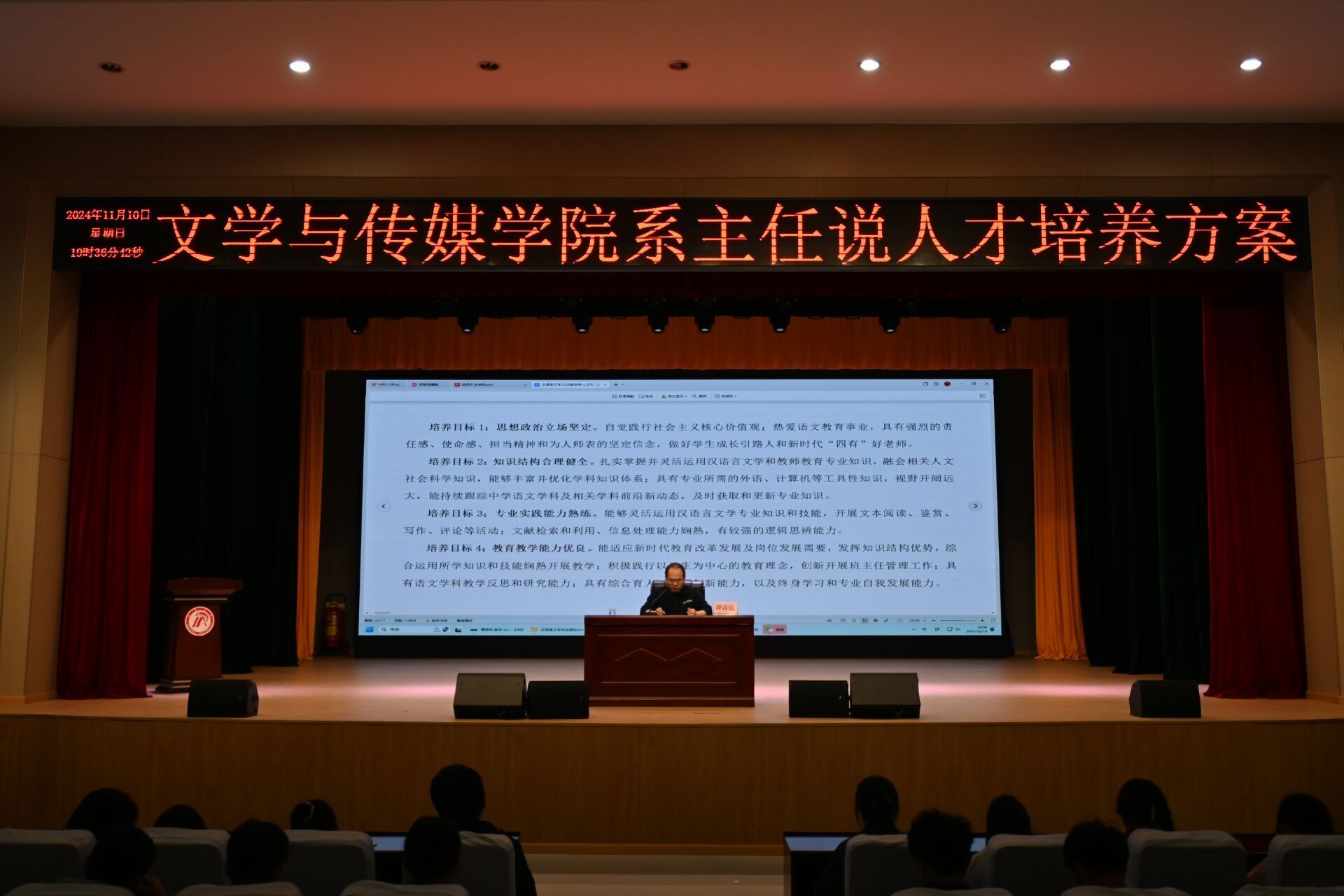 汉语言文学系主任谭诗民、秘书学专业负责人胡少山、秘书与新媒体系主任张建涛,分别面向汉语言文学、秘书学、网络与新媒体专业全体学生开展了“对学生说人才培养方案”活动。三位老师围绕本专业人才培养目标、毕业要求、课程体系和课程设置、第二课堂课表等向学生进行了全面解读。