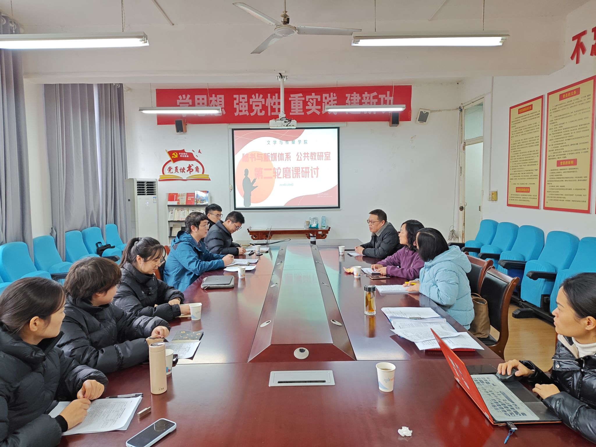 为进一步提高教师课堂教学水平,落实学校教育教学审核评估工作要求,pp电子网站秘书与新媒体系、公共教研室在12月4日下午联合举办了第二轮磨课研讨活动。活动在2307会议室举行,邀请教学副院长朱云,学院教学督导赵桃、崔瑜现场评点指导,秘书与新媒体系、公共教研室全体教师参与了本轮磨课研讨活动。