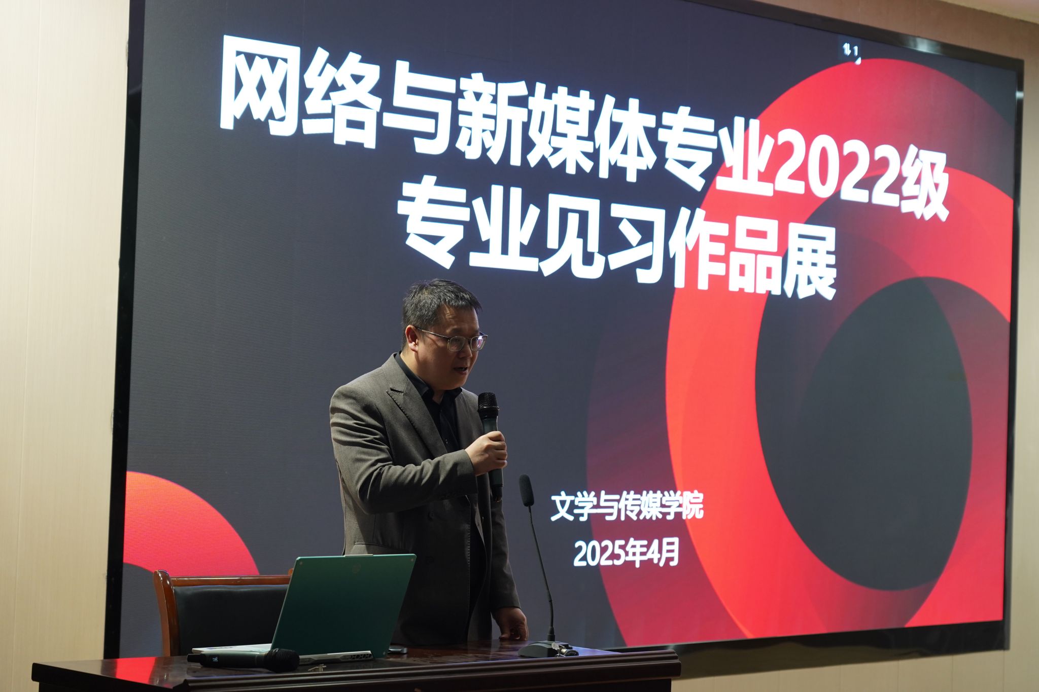 首先,活动负责人张建涛介绍了本次视频作品展的基本情况,指出本次见习视频作品展共收到长视频作品12部、短视频作品36部,这些作品凝聚了学生们的心血与智慧,涵盖了多个题材和风格,充分展现了学生们的创新思维和实践能力。