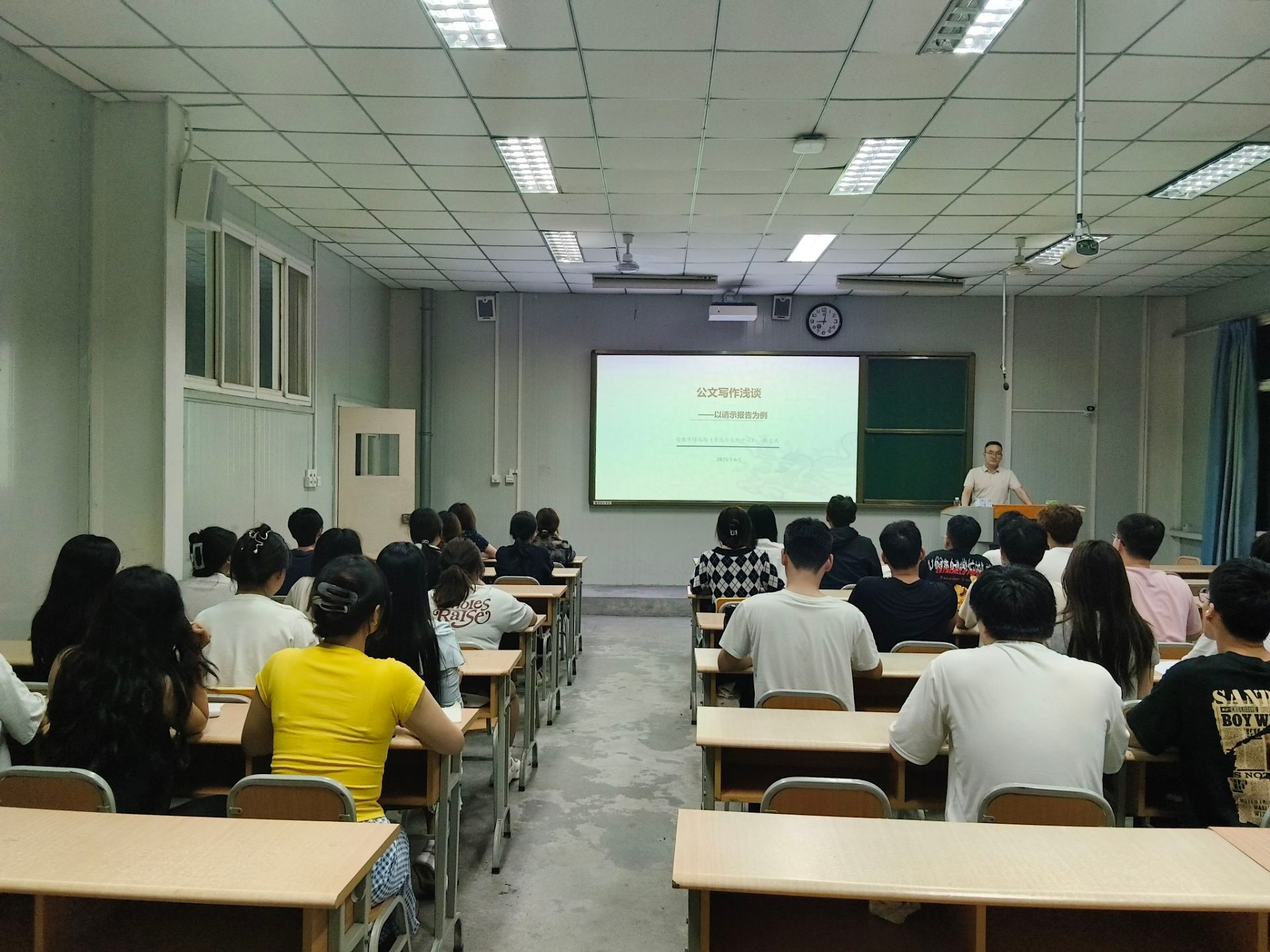 为助力秘书学专业学生适应未来职业发展需要,提升其应用文写作能力,6月4日,pp电子网站在江南校区10号楼1023教室举办了题为“公文写作浅谈——以请示、报告为例”的专题讲座。本次活动邀请安康市政府采购中心张宏亮主讲,由秘书学专业负责人胡少山副教授主持,秘书学2022级全体学生现场听取了报告。