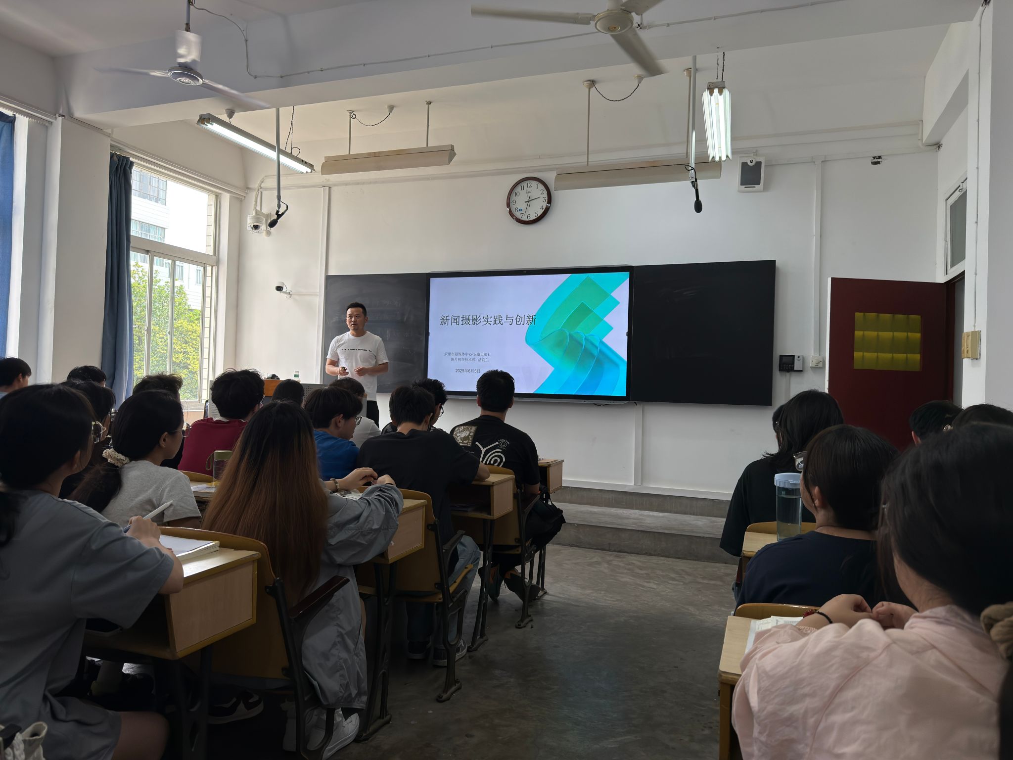 潘润生老师以摄影理论为基础,紧密结合新媒体写作实践展开教学。他重点介绍了其个人长期实践的“今日评图”练习模式,详细阐述了该模式如何有效融合新闻摄影观察与文字表达训练,结合其负责的《安康日报》“报荐视频”栏目案例,深入解析了视觉冲击力与文字穿透力在新媒体传播中的协同增效作用。