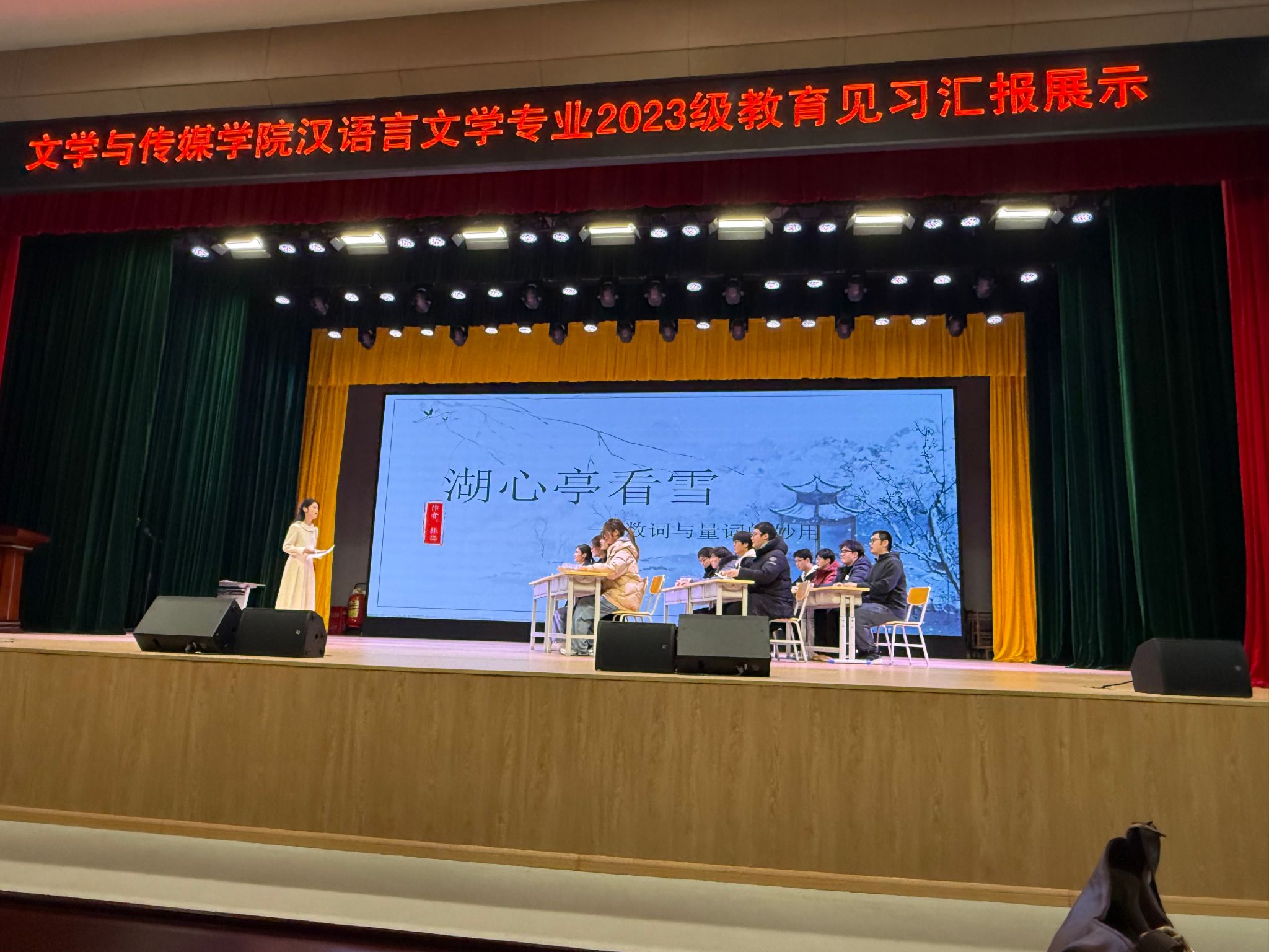 活动开始,主持人介绍了教育见习的重要意义和汉语言文学专业2023级教育见习的基本情况。活动现场,各班见习小组代表依次登台,通过精心制作的多媒体课件、生动的教学片段再现、创意编排的情景剧、详实的教学案例分析及深刻的反思总结全方位呈现了他们在三所见习学校的听课观摩、名师讲座、教研活动体验、基础教育调研等方面的收获与思考。最后,2023级1班公费师范生杨紫琪同学带来的微课教学展示《湖心亭看雪》为本次活动画上了圆满的句号。