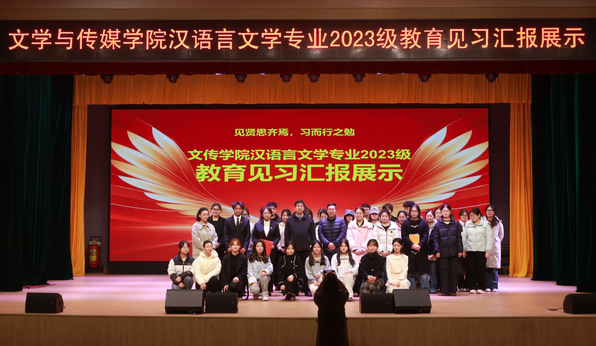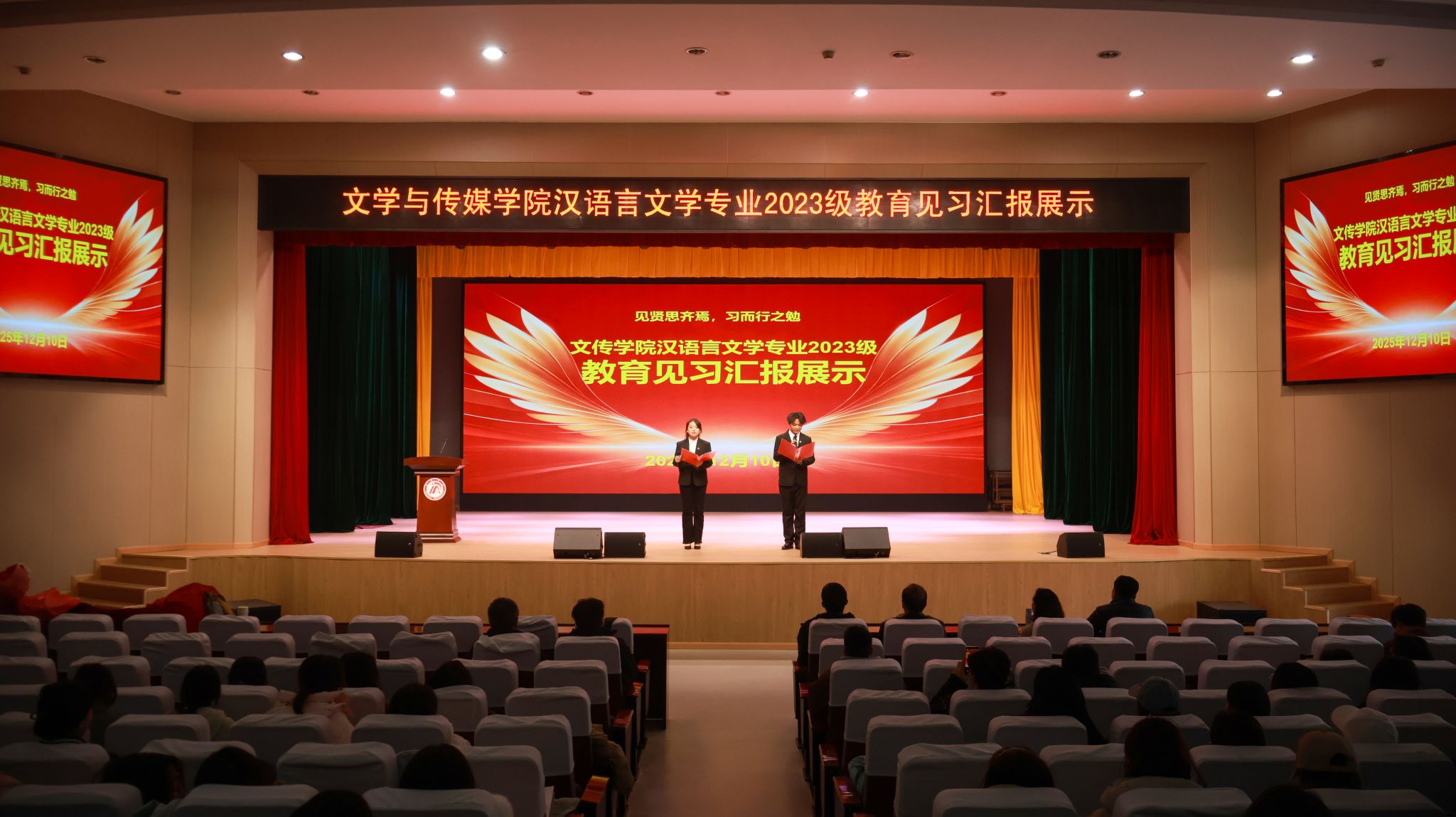 12月4日下午4点半,pp电子网站在江南校区大礼堂隆重举行汉语言文学专业2023级教育见习1汇报展示活动。本次活动旨在全面检验与展示2023级学生的教育见习成果,搭建交流互鉴平台,深化师范生对中学语文教育教学的理论认知与实践体悟。学院领导、两办主任等出席活动。本次活动由学科教学论任课教师张格瑄策划指导,汉语言文学专业2023级全体学生参加。