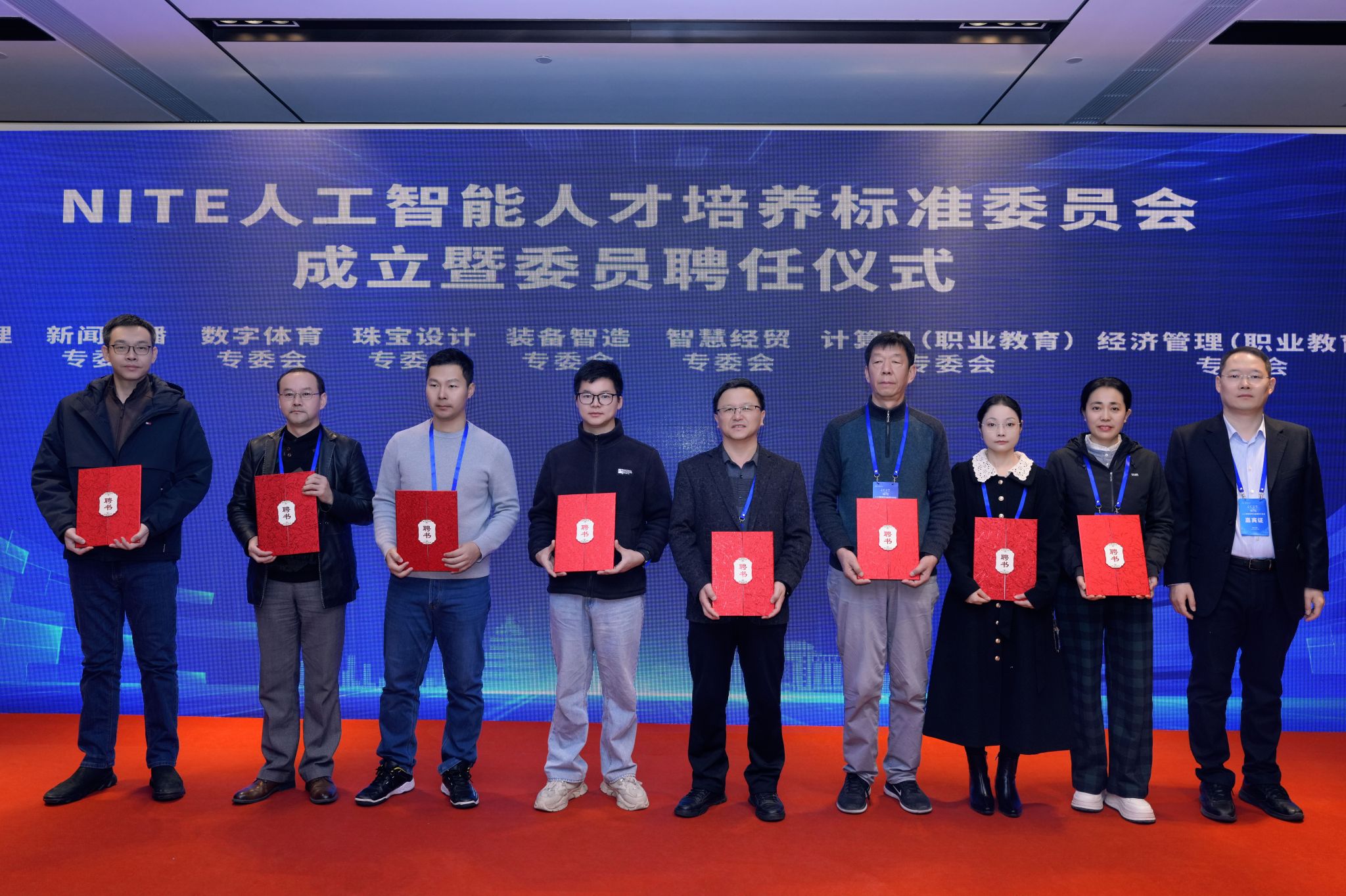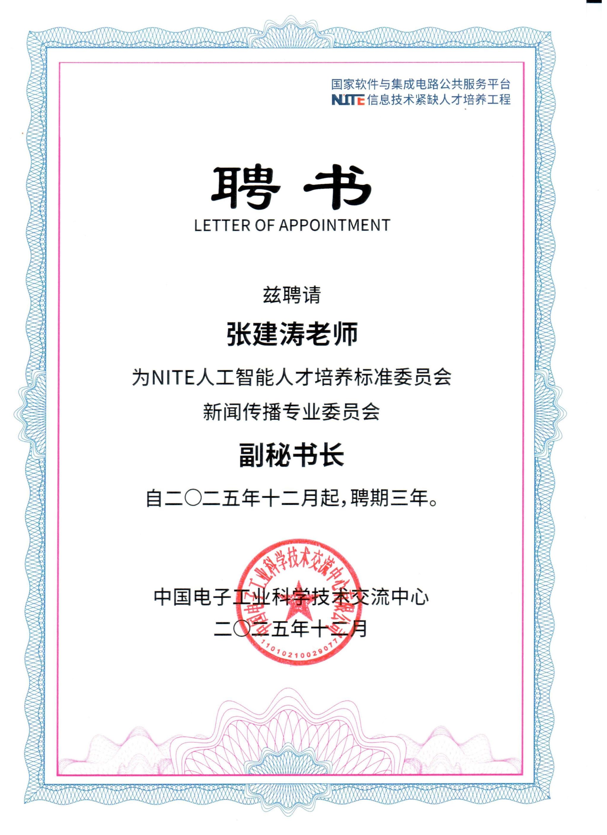 会议期间,举行了NITE人工智能人才培养标准委员会成立仪式,张建涛被聘为NITE人工智能人才培养标准委员会新闻传播专业委员会副秘书长”。