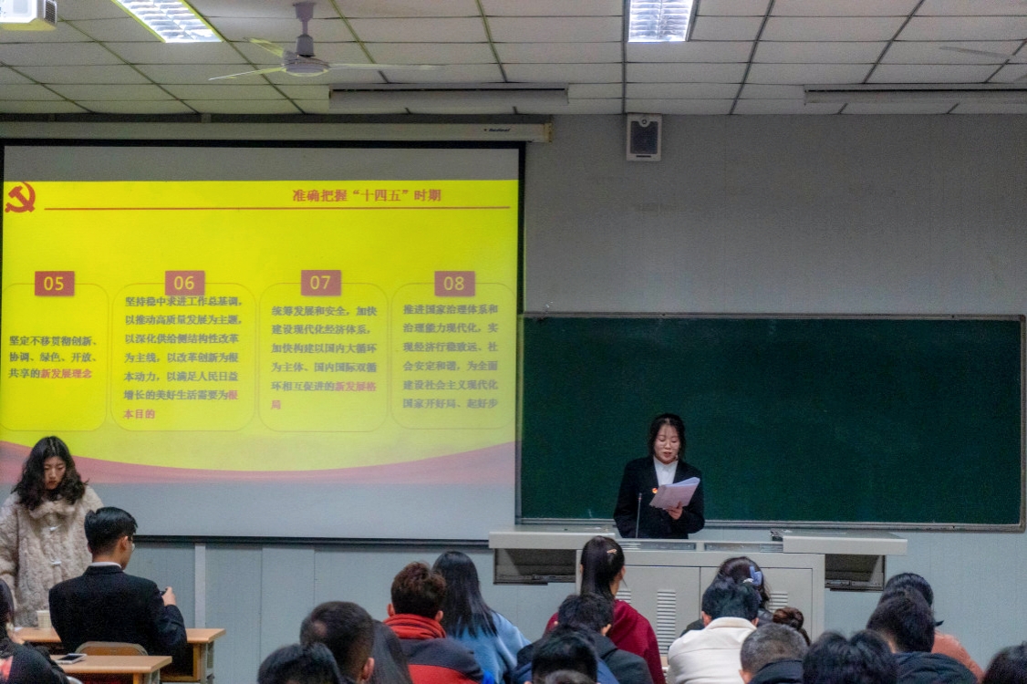 党的十九届五中全会擘画了我国未来发展的宏伟蓝图,作出了应对变局、开辟新局的顶层设计,在党和国家发展进程中具有全局性、历史性意义。宏伟蓝图鼓舞人心,学习宣讲凝聚力量。为全面落实党的第十九届五中全会精神,由学工部、马克思主义学院主办,pp电子网站协办的十九届五中全会宣讲活动于12月23日在江南校区10号教学楼1012室举办。pp电子网站党支部副书记杨海蓉、pp电子网站学生宣讲团成员、pp电子网站全体团学干部参加本次宣讲活动。活动由杨海蓉主持。