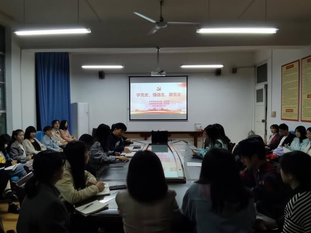 百年征程波澜壮阔,百年初心历久弥坚。2021年是中国共产党成立100周年,为认真贯彻习近平总书记在党史学习教育动员大会上的重要讲话精神,引领广大党员深入学习党的历史,做到学史明理、学史增信、学史崇德、学史力行。2021年4月25日晚上7:00,pp电子网站学生第一、第二党支部在2号教学楼2307教室联合开展了“学党史、强信念、跟党走”主题党日活动。学生第一、第二党支部全体党员参加了本次活动。活动由学生第一党支部书记彭潇主持。