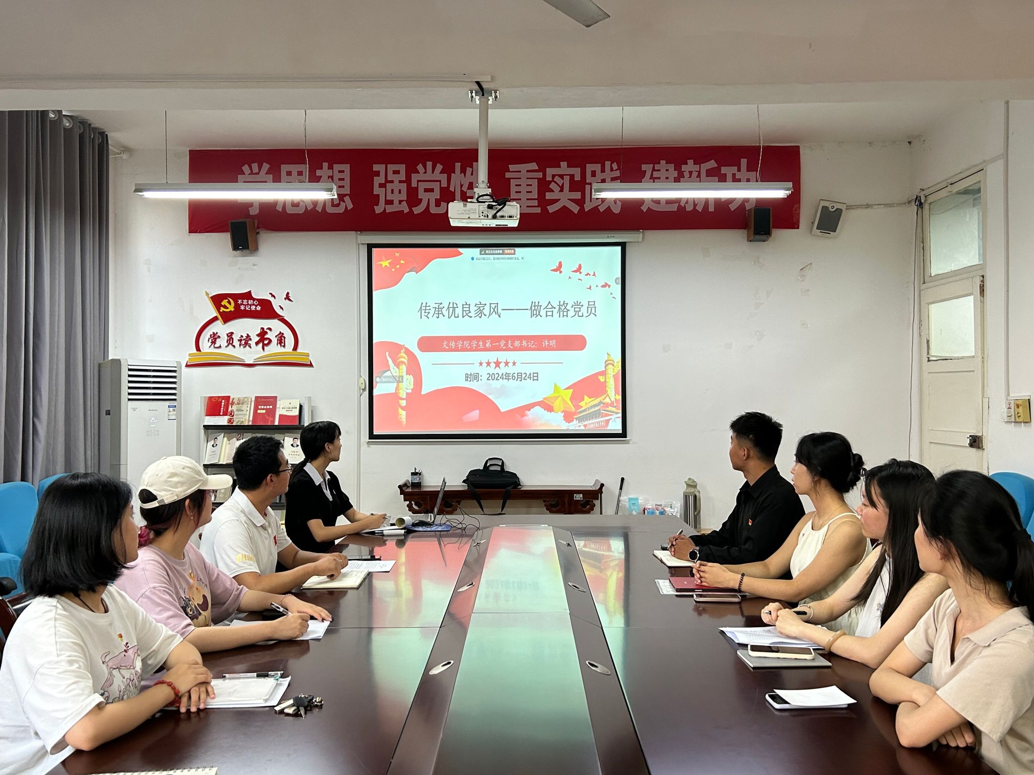 为深入开展党纪学习教育,传承党的优良传统和光荣作风,2024年6月24日下午,pp电子网站学生第一党支部书记以“传承优良家风家训,做合格党员为主题”为全体党员讲了一堂生动的党课。