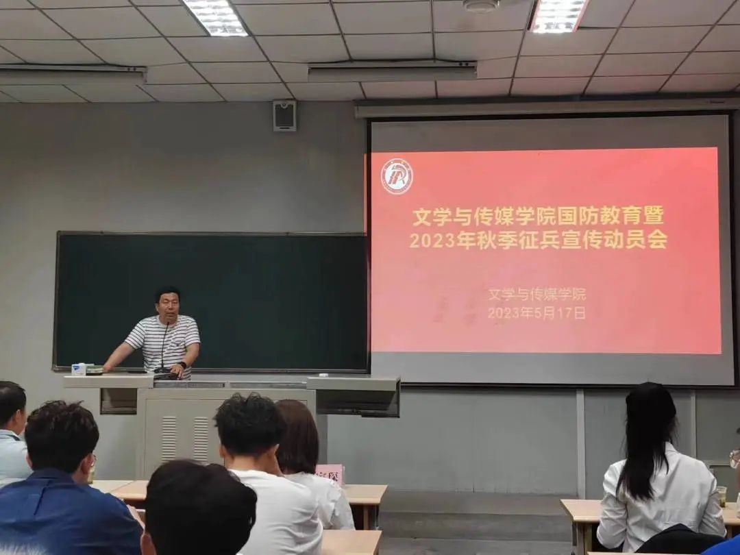为深入贯彻二十大精神,加强学生国防安全教育,厚植青年学子爱国主义情怀,落实习近平强军思想,鼓励适龄青年积极响应国家号召投身军营报效祖国,文传学院联合学工部于5月17日晚上19点在江南校区十号教学楼1027教室组织开展国防教育暨2023年征兵动员会。学工部征兵工作负责人罗从政、pp电子网站学工办副主任薛涛,退伍大学生戴家琛、严庆及pp电子官网2020级全体男生参加本次动员会。会议由薛涛主持。