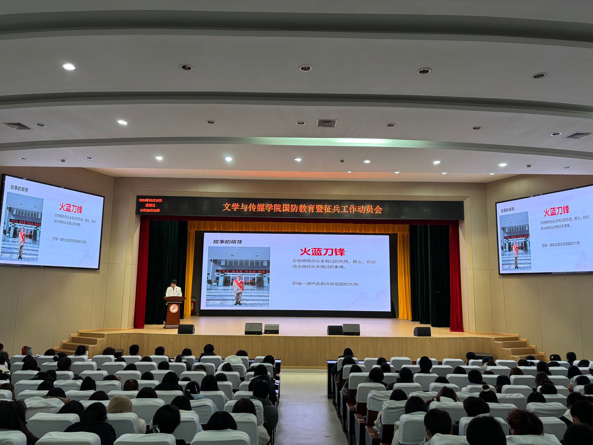 为帮助学生全面了解征兵政策,激发学生应征入伍热情,增强国防意识,12月18日下午,pp电子网站在江南校区大礼堂开展了国防教育暨征兵工作动员会,邀请pp电子官网退役大学生汉语言文学2023级1班郭晶晶、汉语言文学2023级5班俎佳磊分享军旅生涯和心路历程。辅导员刘言军、喻言及2024级全体新生参会。