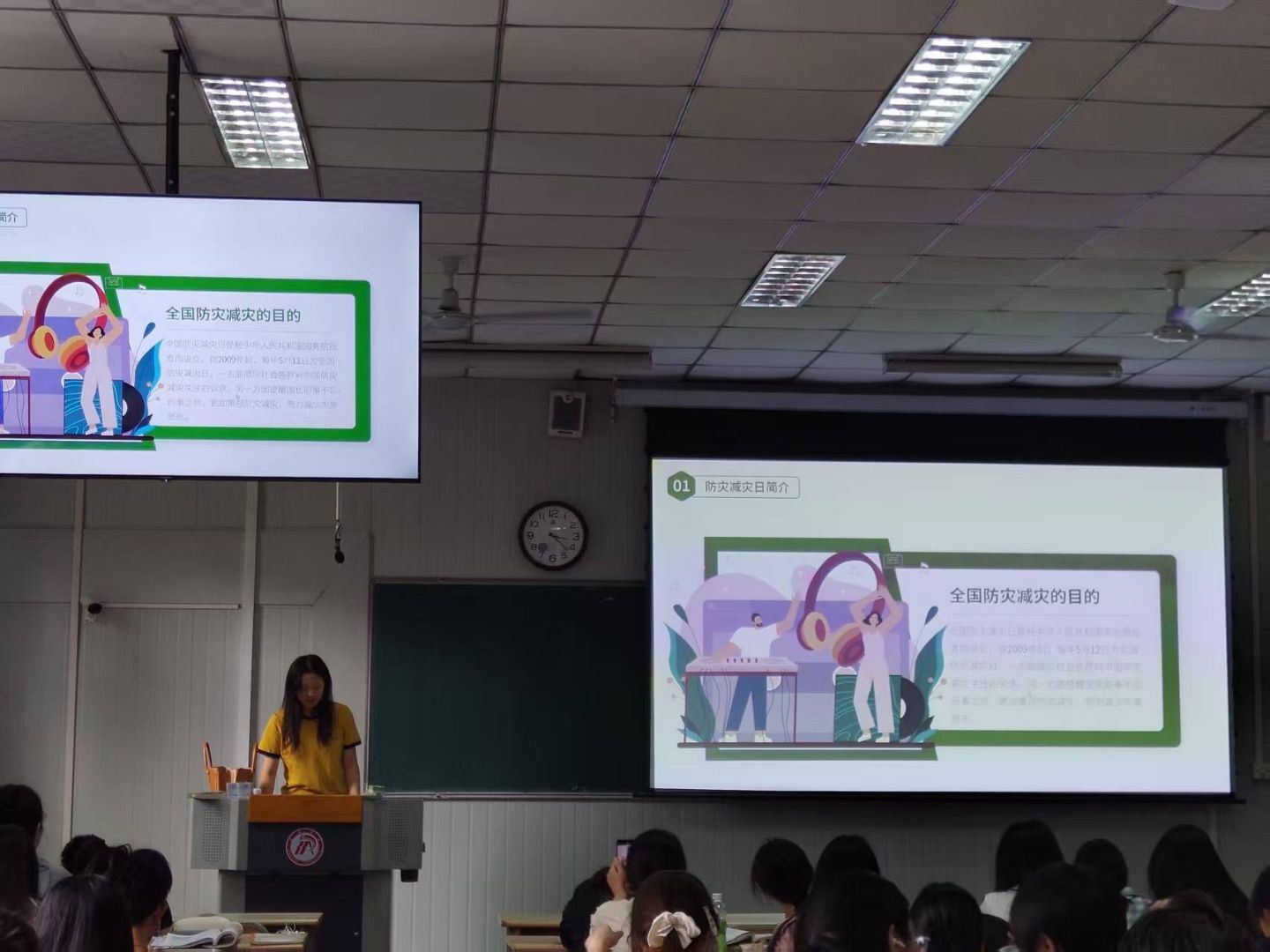 班会以“减轻灾害风险,守护美好校园”为主线,通过播放科普视频、展示真实案例,向学生普及地震成因、震前预兆及震后自救等知识。辅导员老师结合学院实际情况,向同学们详细讲解了教学楼、宿舍等场所的应急疏散路线及注意事项,并现场指导学生掌握“伏地、遮挡、手抓牢”的避险要领。