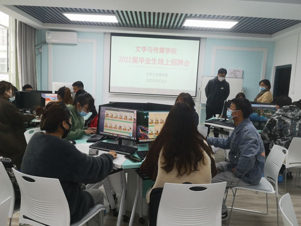 pp电子网站按照学校就业工作安排,积极配合,组织本院2022届毕业生于2022年3月22日上午在2号教学楼2414实训室集体参加本次线上招聘。pp电子网站党总支书记芦伟、副书记杨海蓉、毕业班辅导员艾全霞、网络与新媒体专业课教师张建涛现场指导,毕业生进入线上招聘会场,甄选专业相关岗位,积极投递简历,与用人单位沟通,互动效果良好。