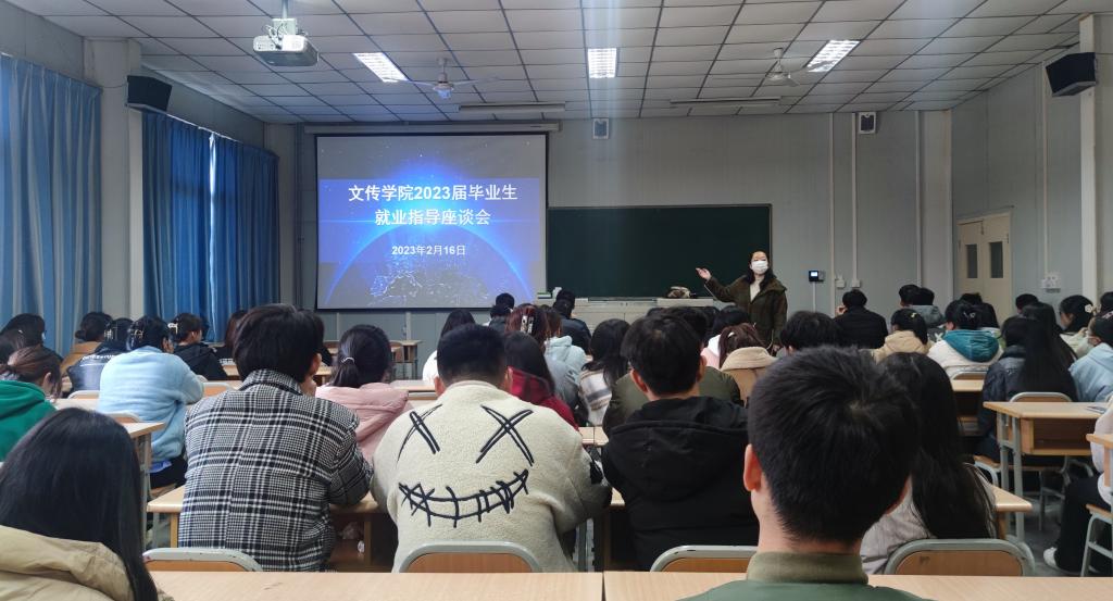 2023年2月16日下午,pp电子网站在1012教室召开汉语言文学、网络与新媒体专业2023届毕业生就业指导座谈会,汉语言文学、网络与新媒体专业2019级全体在校生参会,会议由辅导员老师彭潇主持。