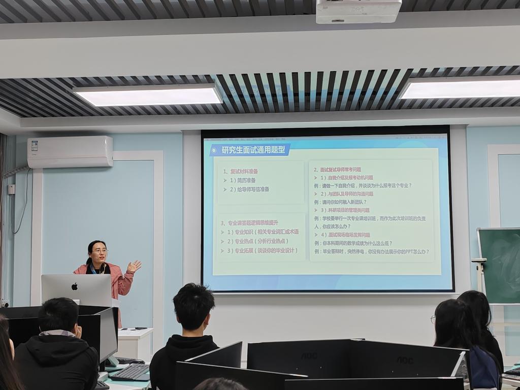 郭祖凤对本届考研同学取得的优异成绩给予了充分肯定,并希望考生们能在此次考研交流会上有所收获。她向考生具体介绍了复试流程,让考生从品质、能力、思维、心态等四方面进行准备,讲解了研究生面试的考试制度和通用题型,分享报考和复试技巧,引导同学们了解导师信息,根据自己的实际情况选择适合自己的导师。最后提醒大家面试时要把握好细节,注重面试礼仪。
