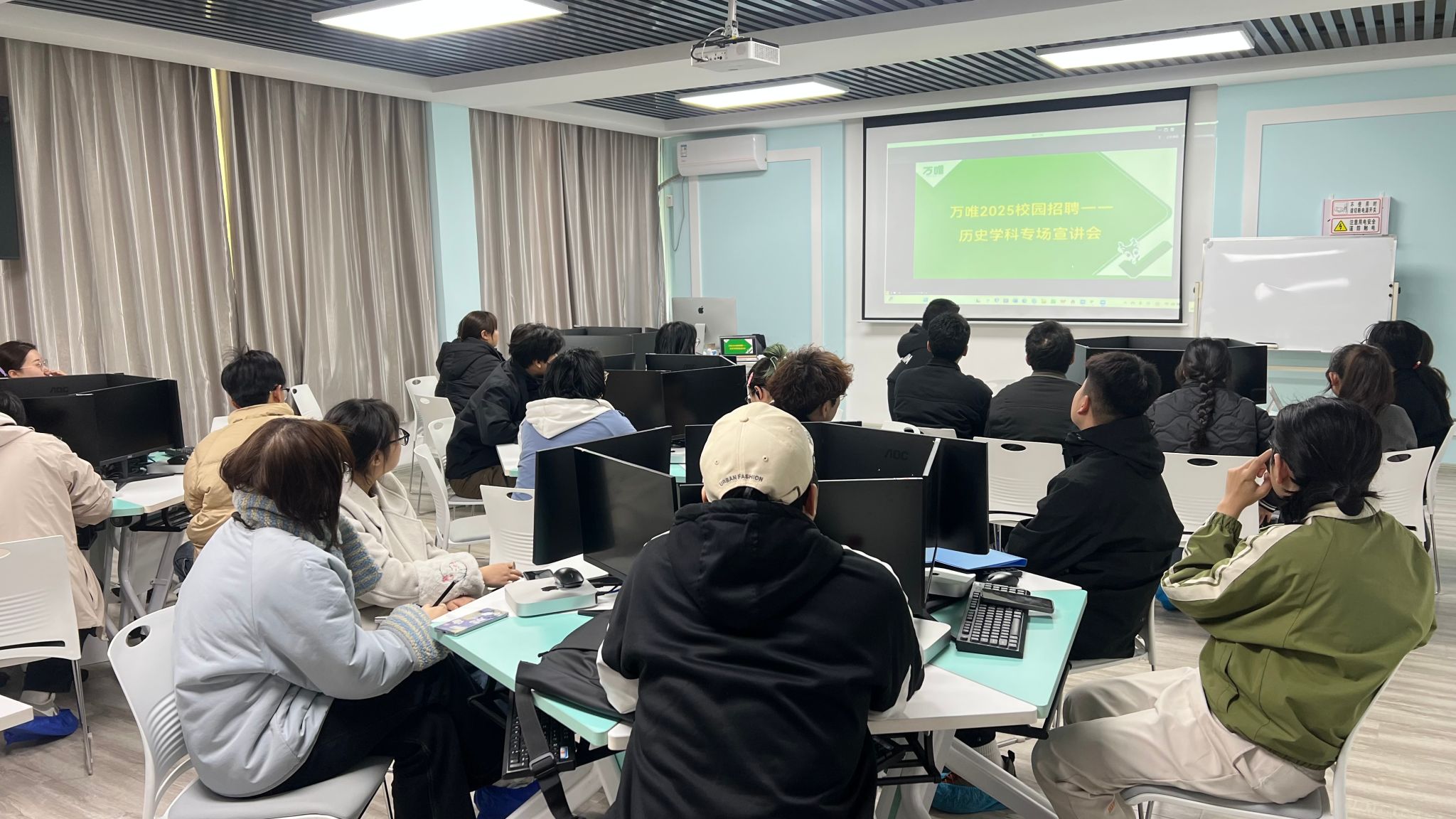 作为全国中考教辅领域的标杆企业,万维集团本次专设历史学科招聘专场,吸引学生积极参与。宣讲会中,企业负责人主要通过公司介绍、岗位介绍、培训与福利和答疑环节这四个方面来向大家介绍,不仅向大家展示了优质企业的招聘要求,还为大家剖析了岗位职责与晋升路径。现场学生通过大屏幕实时观摩云端宣讲,就职业发展、薪资待遇等问题踊跃提问,现场氛围热烈。