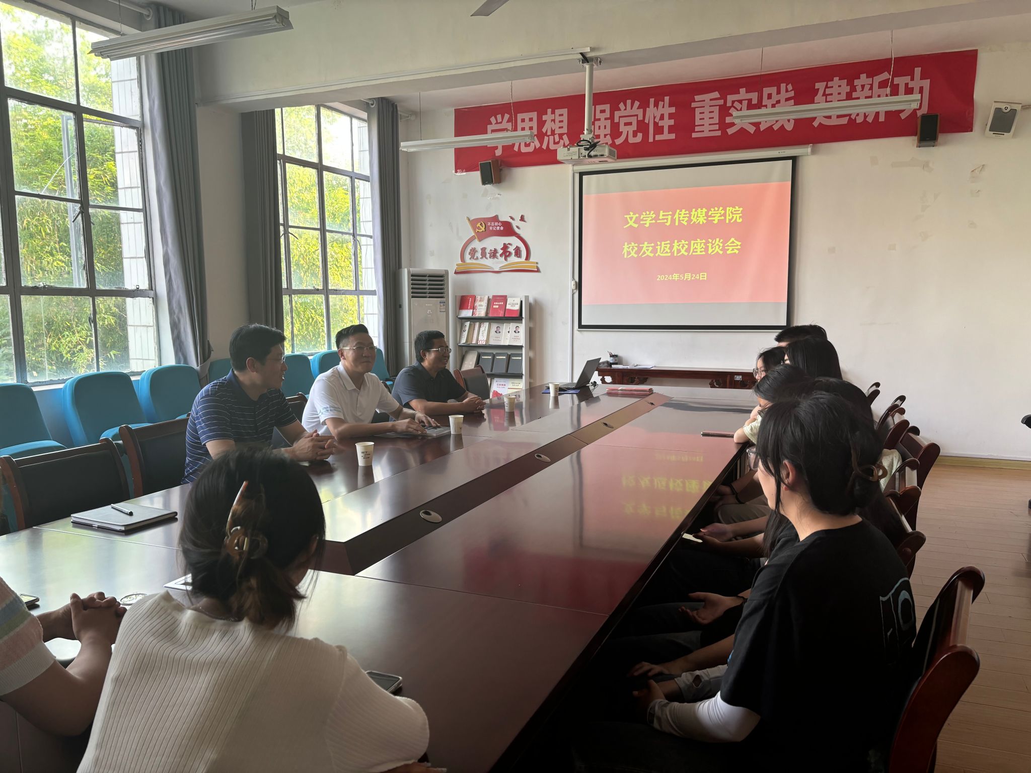 座谈会前,党总支书记芦伟、辅导员邹棠华陪同校友参观了学院文化环境及新修建的数字文传多功能室。