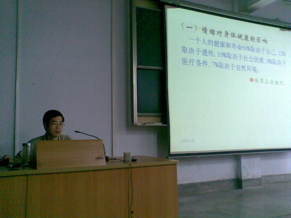 5月26日下午,在一号教学楼六楼报告厅,活动组织者以别开生面的形式举行了一场“女生心理沙龙”,邀请了中文系副教授王瑛老师,著名作家中文系副教授李春平老师,教科系王小康老师等嘉宾参加本次活动。中文系08级学生在沙龙上以互动的形式与几位老师展开心的交流。老师们生动幽默的语言,精彩传神的表演,使同学们在轻松愉快的环境中与老师们一起探讨当代女生存在的心理问题及大学生恋爱问题,让同学们了解了大量的心理知识,对本次沙龙也留下了深刻印象。