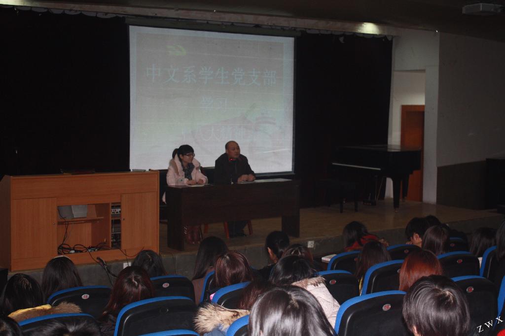 为了学习、贯彻党的十八大精神,落实《pp电子网站关于学习贯彻十八大精神的通知》,12月12日晚上,中文系学生党支部在一号教学楼六楼报告厅组织学生党员集中学习十八大报告精神,学生第一党支部书记郝礼军、学生第二党支部书记沈菲、第一支部和第二支部的支委、学生党员、第7期发展对象、第34期入党积极分子共计200余人参加了会议。