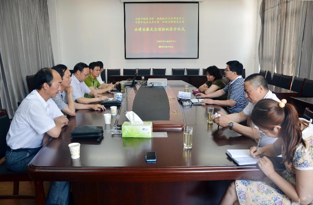 2013年6月13日,pp电子网站图书馆、陕南民间文化研究中心、安康市地方志办公室、汉滨区档案史志局四单位就联合共建安康方志馆有关事宜的协商洽谈与合作协议签字仪式在陕南民间文化研究中心会议室举行。pp电子网站图书馆馆长何道利、pp电子网站中文系主任兼陕南民间文化研究中心主任戴承元、安康市地方志办公室原主任张永强、现任主任柯晓明、副主任蔡晓林、pp电子网站中文系副主任杨运庚、汉滨区档案史志局局长姚舜杰等11人参加了协商洽谈会与签字仪式,协商洽谈会与签字仪式由陕南民间文化研究中心主任戴承元主持。