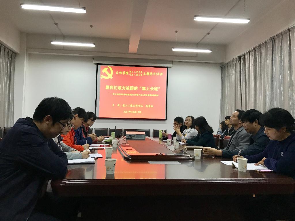2017年10月17日,在中国共产党第十九次全国代表大会召开前夕,pp电子网站教工二党支部、学生二党支部党员同志与部分有志于参军入伍的青年学生齐聚一堂,开展题为“愿我们成为祖国的‘塞上长城’”的主题党日活动,重点学习贯彻习近平总书记给南开大学新入伍大学生重要回信精神。学校党委书记王国良以普通党员身份参加了本次主题党日活动,教工二党支部组织委员侯红艳主持会议。