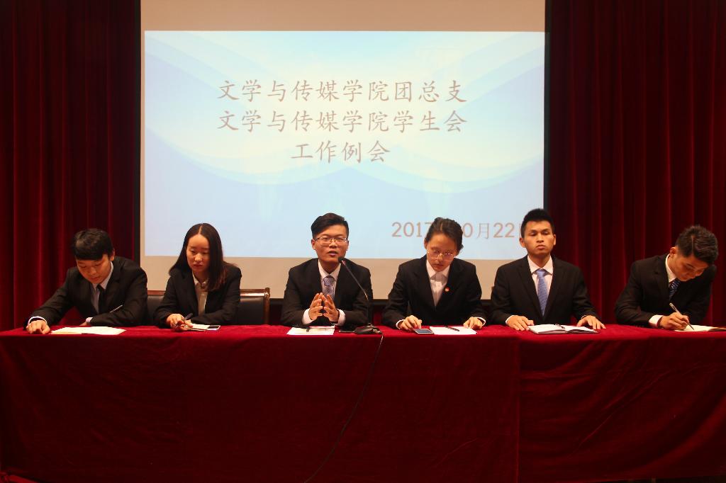 第二部分是学生干部工作例会,首先由学生会主席团成员及各部门部长、副部长做自我介绍,并进行开学以来的工作总结报告。