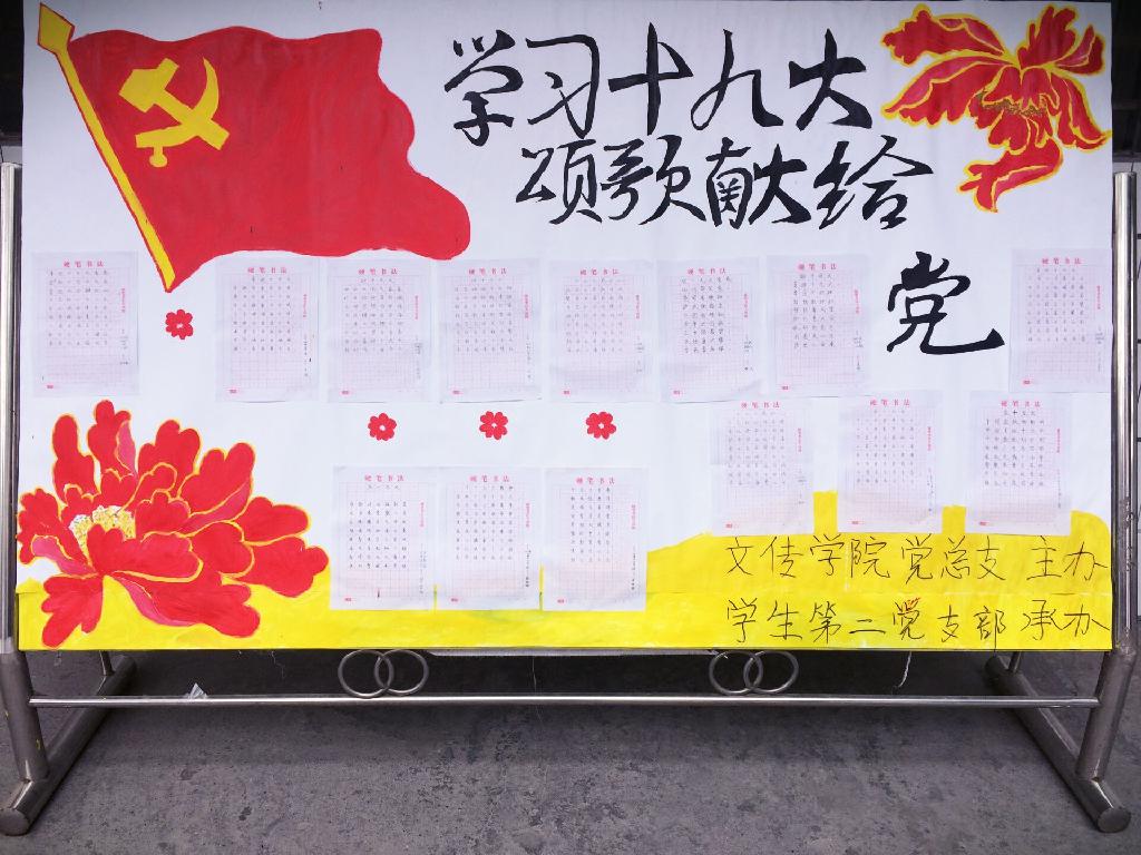 在全校上下掀起学习宣传贯彻落实党的十九大精神热潮之际,为凝聚青年共识,发挥青年力量,培养大学生爱党爱国情怀,引导青年大学生听党话、跟党走,在实际行动中践行伟大精神、贡献青春智慧、展现青春风采。由pp电子官网总党支主办,学生第二党支部承办,pp电子网站教师郑继猛指导,学生第二党支部的学生党员、积极分子根据学习十九大精神的心得体会结合所学专业知识,所精心撰写的“学习十九大 颂歌献给党”主题诗歌创作展于12月11日—12月17日在二号教学楼林荫道展出。