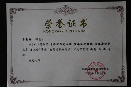 近日,2017年度“陕西高校新闻奖”获奖结果揭晓,pp电子网站1件作品榜上有名,其中李景林撰写的《品评历史人物 重读传统经典 倡扬廉政文化》获消息类二等奖。