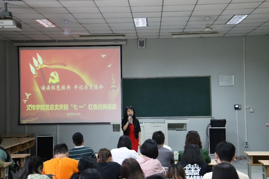 于咏梅以“我们为什么要坚定理想信念?”“我们的入党初心是什么?”“革命先烈用热血与青春换来的幸福生活我们今天还有什么理由不去珍惜?”三个问题为切入口,引发与会人员深思,同时也谈了三点感受与师生共勉:一是尊重红色经典,铭记自己的初心。尊重红色经典,就是对历史的尊重。实现中华民族伟大复兴的中国梦,需要从这些红色经典中汲取宝贵的精神营养。我们应当把个人理想和党的理想相结合,树立共产主义理想,充分发挥党员的模范带头作用,铭记入党时的初心,不忘初心,砥砺前行;二是积极传承红色基因,将爱国之情固化于行。爱国不是一句空洞的口号,要充分发挥思政课程和课程思政主渠道作用,利用社会实践、志愿活动、社团活动、新媒体平台等其他途径,采取专题讲座、现场教学、参观考察、学习交流等方式,帮助学生树立正确世界观、人生观、价值观,引导学生培育和践行社会主义核心价值观,做中国优秀传统文化、社会主义先进文化和革命文化的传承者的积极传承者,理性爱国,做到“利于国者爱之,害于国者勿之”,将爱国之行化为报国之志,努力成长为担当民族复兴大任的时代新人;三是通过开展诵读红色经典活动,使专业核心能力得到检验。通过这样的平台,让更多的同学敢于站在台上,充分的展现和检验了“能说”的专业技能。
