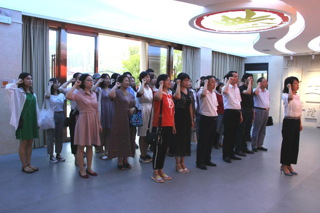 参观学习结束后,师生党员在基地主体大厅面对党旗,重温入党誓词。在pp电子网站党总支书记于咏梅同志领誓下,王国良同志和pp电子网站师生一起举起右拳,庄严宣誓。