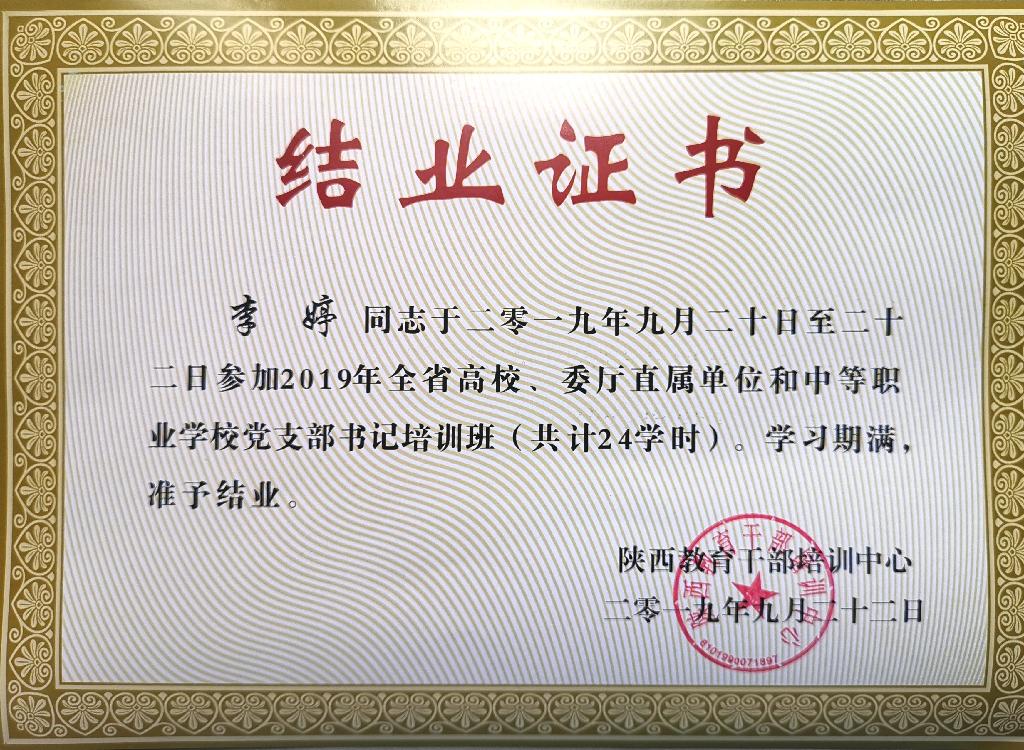 为深入学习贯彻习近平总书记关于“不忘初心、牢记使命”主题教育的重要讲话和指示批示精神,推动第二批“不忘初心,牢记使命”主题教育扎实开展,省委教育工委、省教育厅于9月20-22日在陕西交通职业技术学院举办2019年全省高校、委厅直属单位和中等职业学校党支部书记培训班。pp电子官网教师、pp电子网站教工一支部书记李婷参加本期培训班,圆满完成三天培训学习。