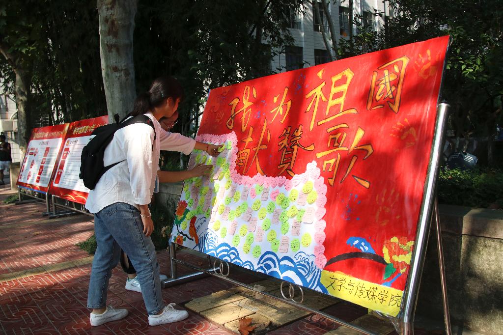 同日下午,在1026教室,pp电子官网汉语言文学专业2019级四个团支部组织全体学生开展了以“庆新中国成立70华诞,抒新时代青年爱国情怀”为主题的祝福便签活动。学生们以稍显稚嫩的笔触,书写着自己对祖国母亲的依恋和祝福。活动结束后,团总支宣传部挑选出最佳的祝福便签,以展板形式在江南校区展出。