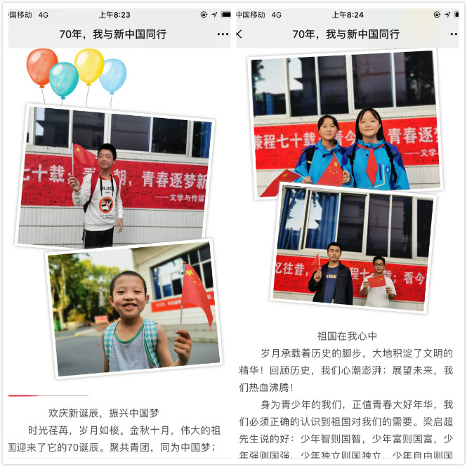 此外,pp电子官网同步开展了线上活动。由网络与新媒体2018级1班团支部全程负责,2018、2019级各团支部参与,拍摄主题为“我为祖国献祝福”的短视频,随后在学院官方抖音账号上进行发布。同时,学院官方微信平台“爱中文”也面向全院发起主题征文活动,并将以“70年,我与祖国同行”为主题进行专题推送。