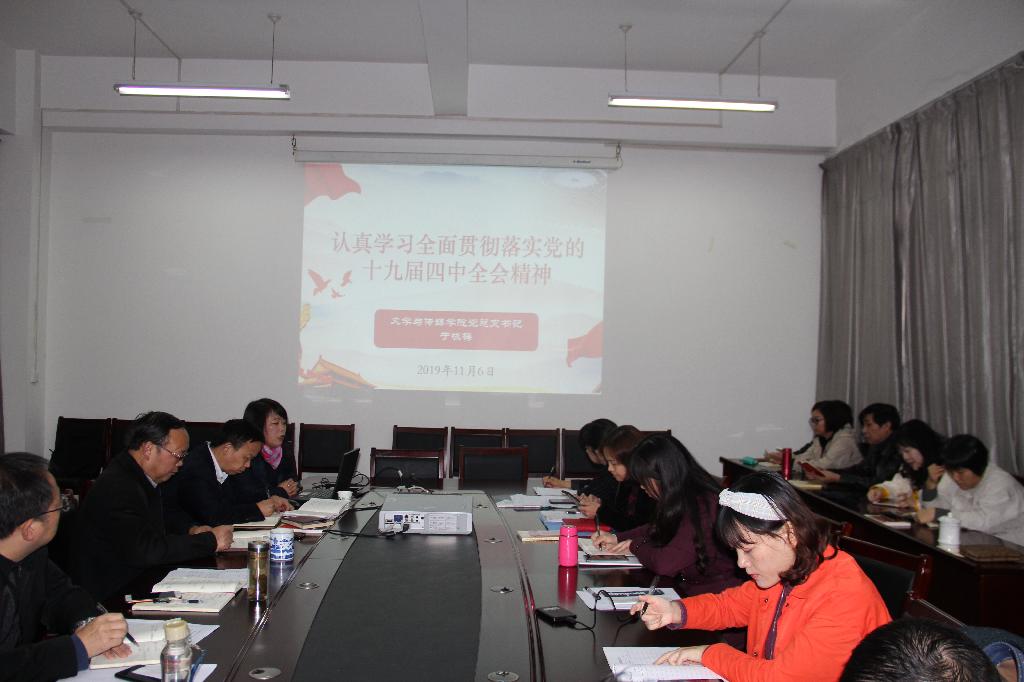 11月6日下午,pp电子网站党总支召开学习传达党的十九届四中全会精神专题会议,全体教师参加会议。