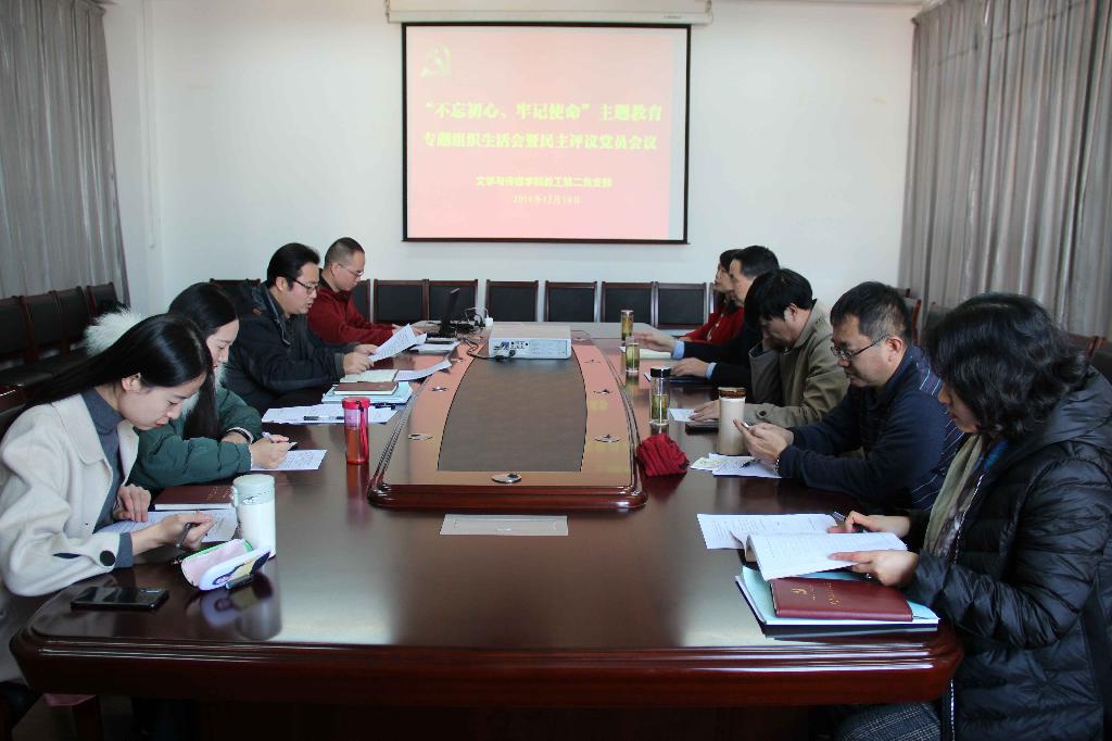 12月10日下午,pp电子网站教工第二党支部在陕南民间文化研究中心会议室召开“不忘初心、牢记使命”主题教育专题组织生活会暨党员民主评议大会,党支部教师参加会议,党委书记王国良作为普通党员全程参与会议,会议由教工第二党支部书记杨明贵主持。