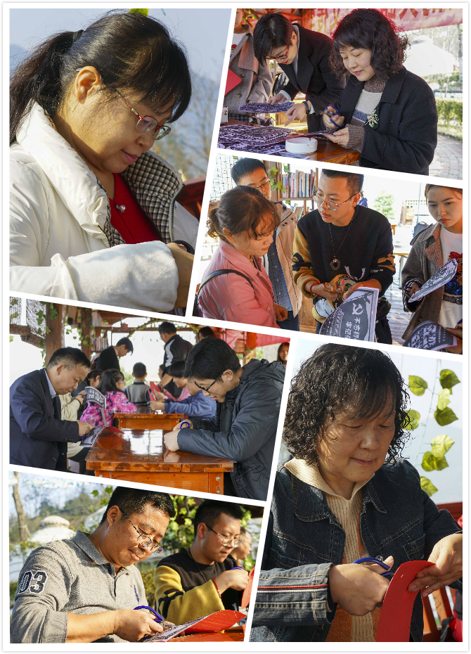 在蒋家坪,教职工们登上山顶,参观了茶园,了解了茶叶产业发展对推动农民增收和乡村振兴的重要作用;在马盘山上,教职工们围坐一起,pp电子官网有剪纸艺术特长学生梁少华一边介绍中华优秀传统剪纸艺术,一边指导老师们用剪刀在红色的纸张上剪出了“坚决跟党走”“不忘初心、牢记使命”等栩栩如生的作品,师生共同沉浸在剪纸艺术氛围中,收获了喜悦,凝聚了情感。