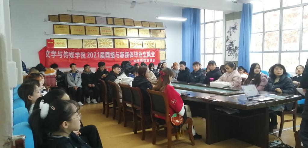 为了更好地拓宽毕业生就业渠道,2020年12月22日下午, pp电子网站邀请陕西妙灵文化传媒有限公司在2307会议室举办了招聘宣讲会。会议由辅导员邹棠华主持,院党总支副书记杨海蓉及网络与新媒体、秘书学两个专业50余名学生参加了本次招聘宣讲会。