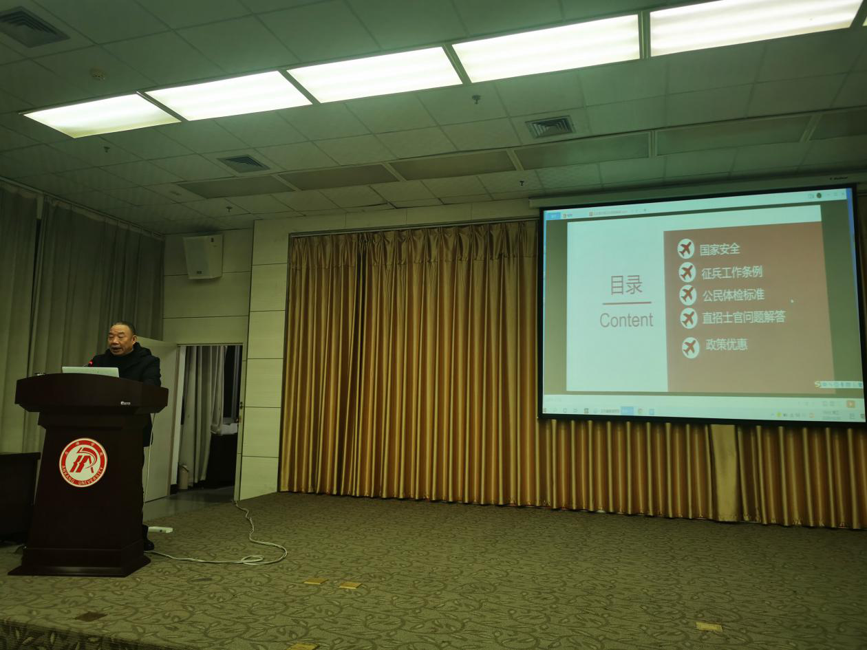 会议伊始,王瑞卫老师从相关法律对军人的优待政策、征兵工作条例、应征入伍体检标准、大学生应征入伍优惠政策、大学生应征入伍流程等六个方面向同学们进行了详细的讲解。他希望广大同学积极响应国家号召,抢抓机遇、迎接挑战,主动投身军营,让人生在实现强军梦中绽放绚丽光彩。