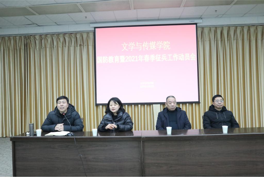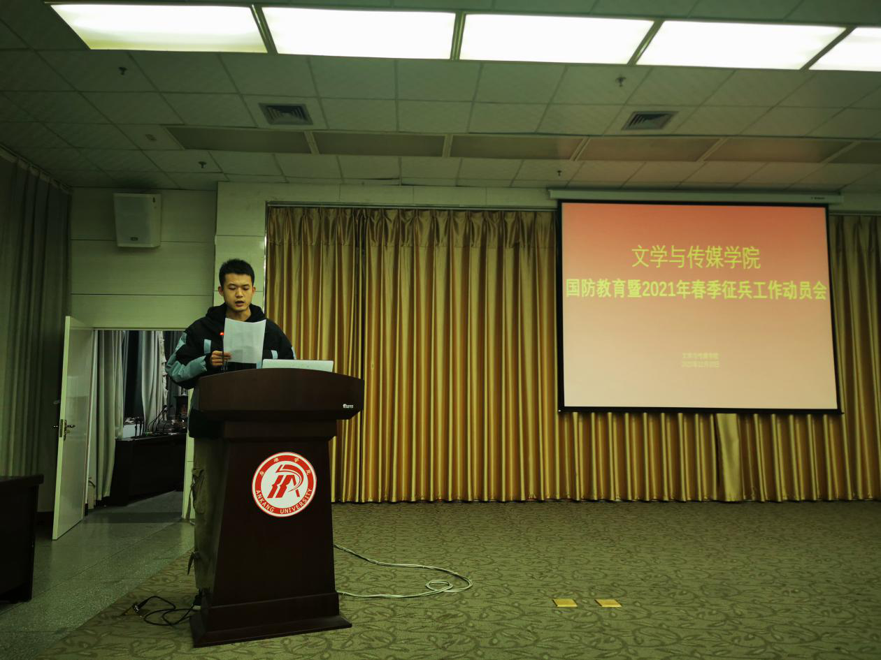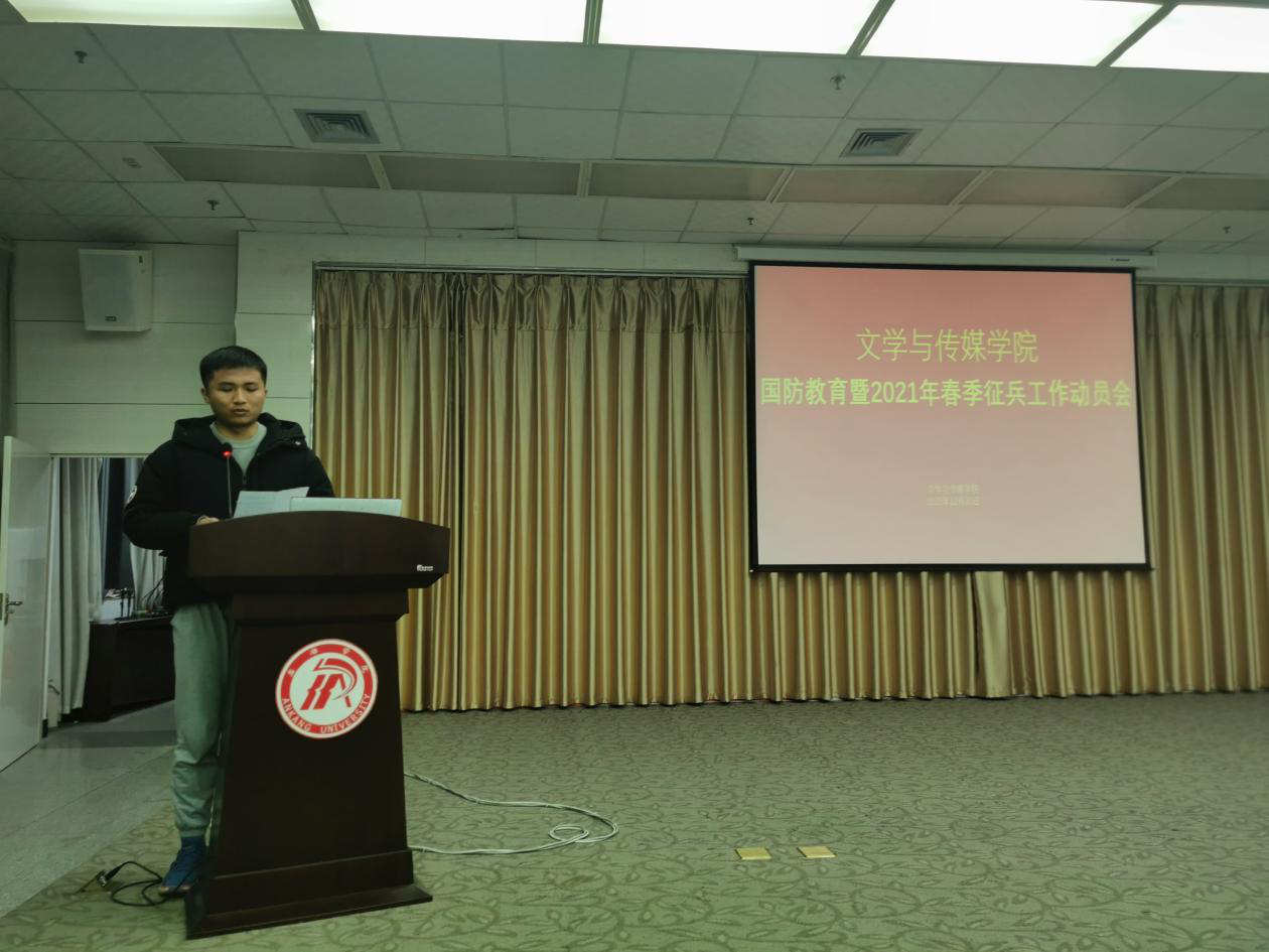 为进一步贯彻落实《新时代爱国主义教育实施纲要》要求,加强新时代大学生爱国主义教育,增强国防意识,激发广大青年大学生积极响应祖国号召参军入伍,保家卫国,2020年12月30日晚19:30,pp电子网站联合学工部在图书馆六楼报告厅召“开国防教育暨2021年春季征兵工作动员会”,学工部王瑞卫,pp电子网站学院党总支副书记杨海蓉、学工办副主任薛涛、辅导员邹棠华老师,退伍大学生代表冯瑞瑞、赵天齐及全院有志参军的200余名同学参加会议。会议由薛涛主持。