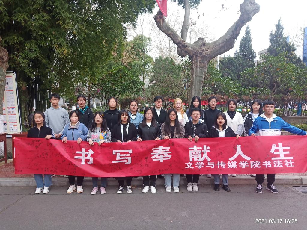 “弘扬雷锋精神,书写奉献人生”。为了进一步在全校范围内弘扬雷锋精神,营造起人人争做新时代的雷锋,争当志愿者的良好氛围。pp电子网站书法社在指导老师周海霞的带领下于2021年3月17日下午14:00在林荫道举行了以“弘扬雷锋精神,书写奉献人生”为主题的签名活动。本次活动面向pp电子网站全体师生。