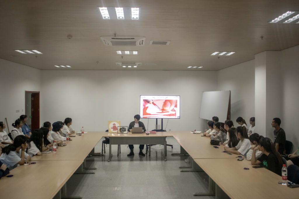 讲座内容由纪录片《身临“秦”境》导入,全面介绍了剪纸的起源、历史沿革、分类、基本纹样以及剪纸中蕴含的民间智慧。梁少华现场示范剪纸的基本技法,由同学们动手尝试剪制作品,并相互交流感受,现场氛围热烈。整场讲座轻松自然,梁少华用他自己的方式,改变了学生对非遗传承人“年纪大”“传统”的刻板印象。
