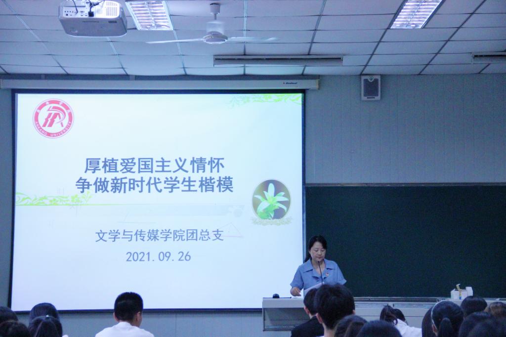 首先,杨海蓉做了题为“厚植爱国情怀,争做新时代楷模”主题团课宣讲。习近平总书记在纪念五四运动100周年大会上的重要讲话中指出:“当代中国,爱国主义的本质就是坚持爱国和爱党、爱社会主义高度统一。”青年是未来国家发展的动力,我国的和谐稳定和持续发展离不开爱国青年的参与。青年应该自觉将爱国主义内化于心、外化于行,坚定立场,时刻反思并努力奋斗,学习科学文化知识,锤炼过硬本领,以国家主人翁的心态看待问题,关心时事,关心国家命运,为国家崛起贡献自己的力量。她在宣讲中提到,知识分子是国家的未来和希望,高校是对青年学生进行爱国主义教育的重要场所,当代大学生要有爱国爱党爱社会主义的远大情怀和崇高的中国梦,强调青年学子要提高自身技能,增强爱国热情,并就孟晚舟女士归国的时事新闻,号召当代大学生要树立远大志向,厚植爱国主义情怀,请党放心,强国有我!