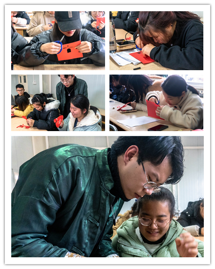 在互动环节,他示范讲解了剪纸四步骤!起稿、剪刻、粘贴、揭离。“纸上得来终觉浅,绝知此事要躬行”,有实践才能获取更多的了解,他分发了精心准备的基础剪纸模板和剪刀,让现场师生动手实践。许多同学都是第一次接触剪纸,兴致勃勃,积极参与体验非遗文化的浓厚底蕴。