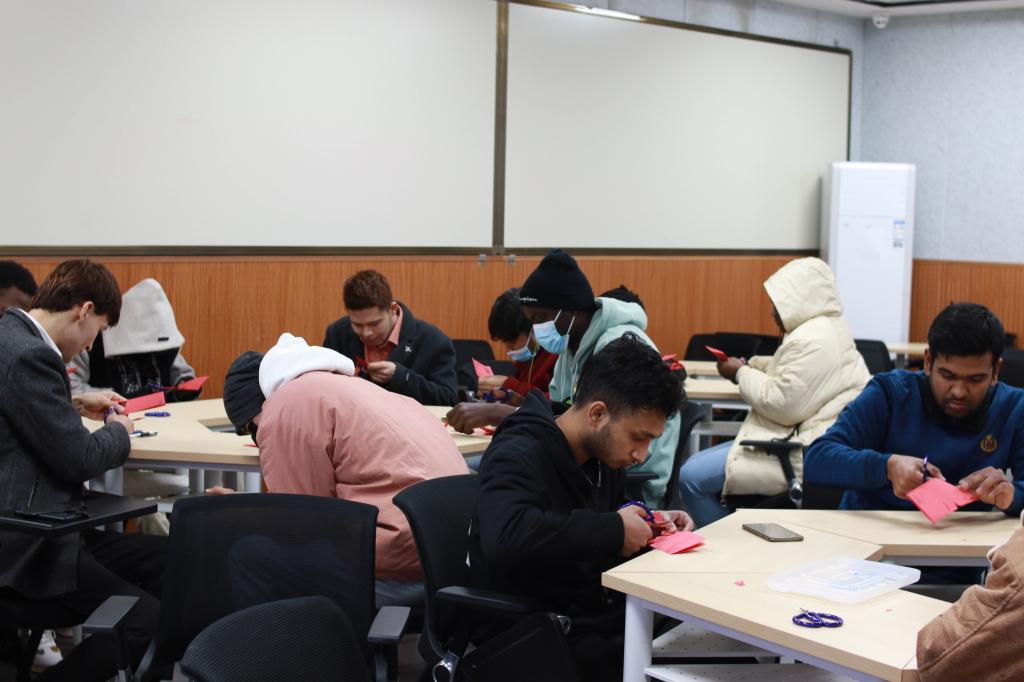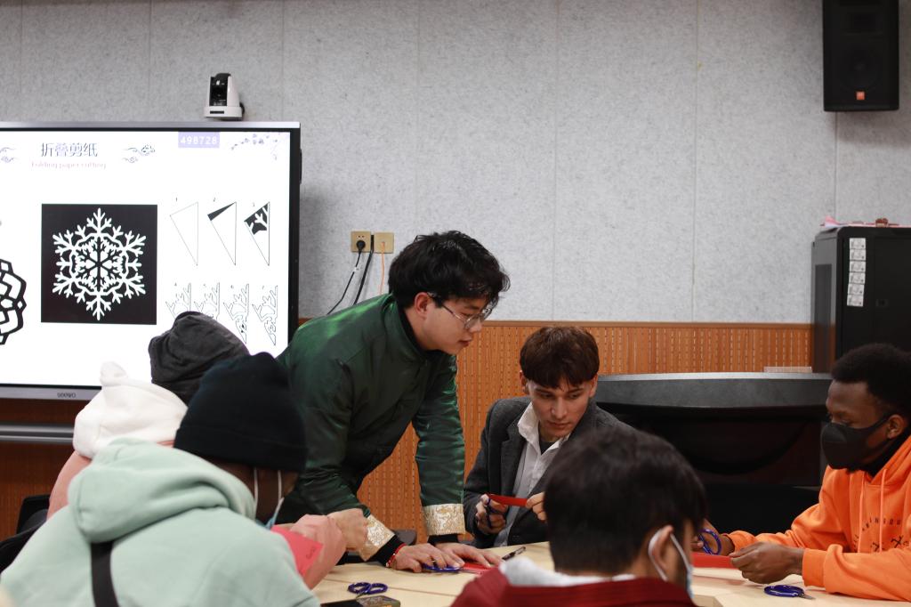 梁少华向同学们介绍了中国剪纸的基本知识和剪制方法,分享了自己所创作的部分作品。简洁的语言及双语版的课件让留学生们对剪纸文化的知识更加清晰的了解,留学生们都听得十分认真,整场讲座欢声笑语不断。