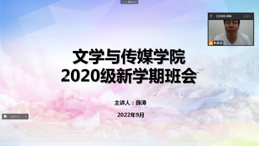 2020级辅导员辅导员薛涛分别从新学期大家状态调整、疫情防控、防范电信诈骗、文明上网等方面进行宣传引导,对《pp电子网站“中学语文卓越师资班”人才培养计划行动方案(试行)》文件进行解读,解答教师资格证报名考试相关问题,并就线上教学向全体同学提出纪律要求。